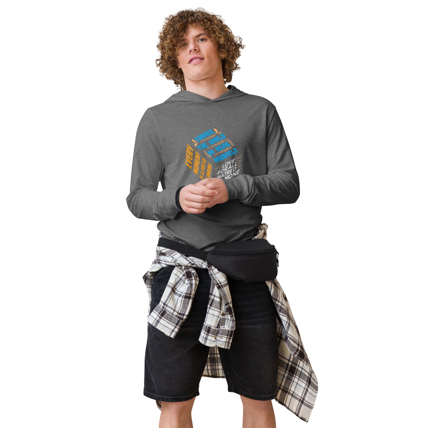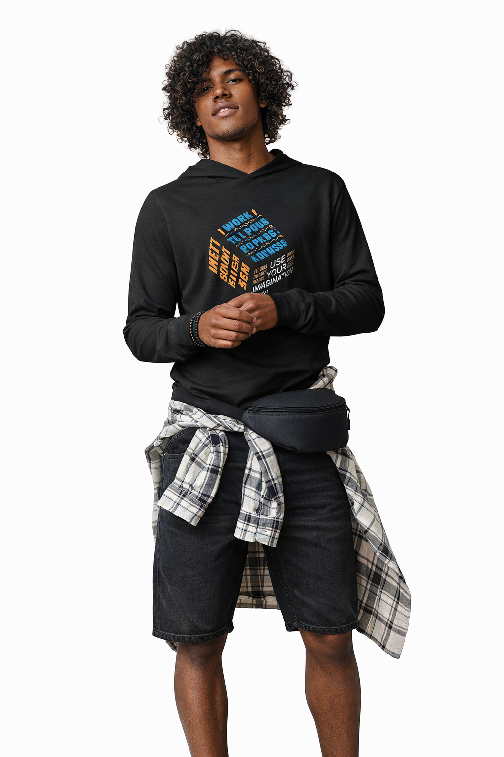 With its long sleeves and comfortable hood, this tee is perfect for layering, allowing you to create stylish outfits all year round. Plus, its lightweight construction allows for unrestricted movement, ensuring that you feel at ease no matter the occasion.